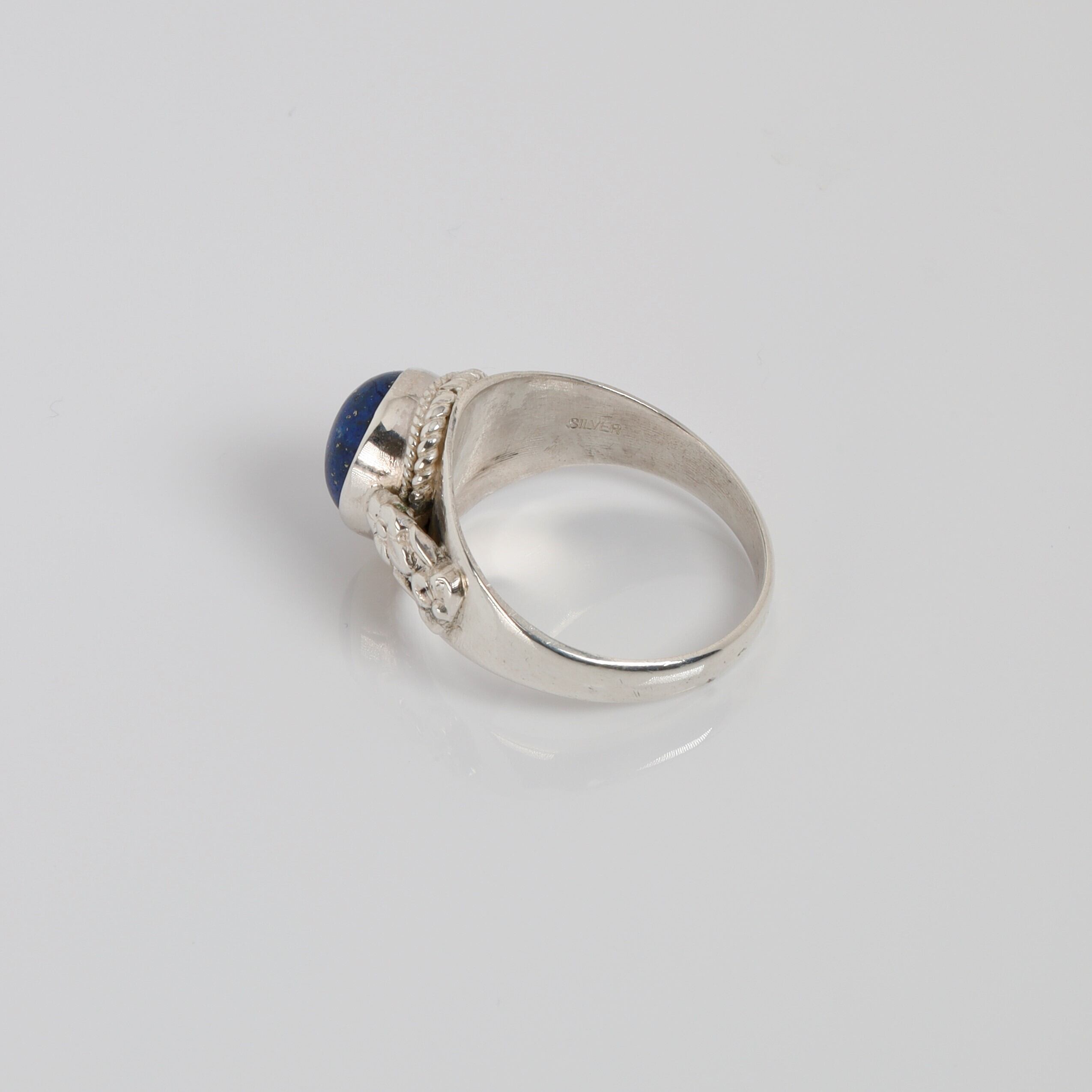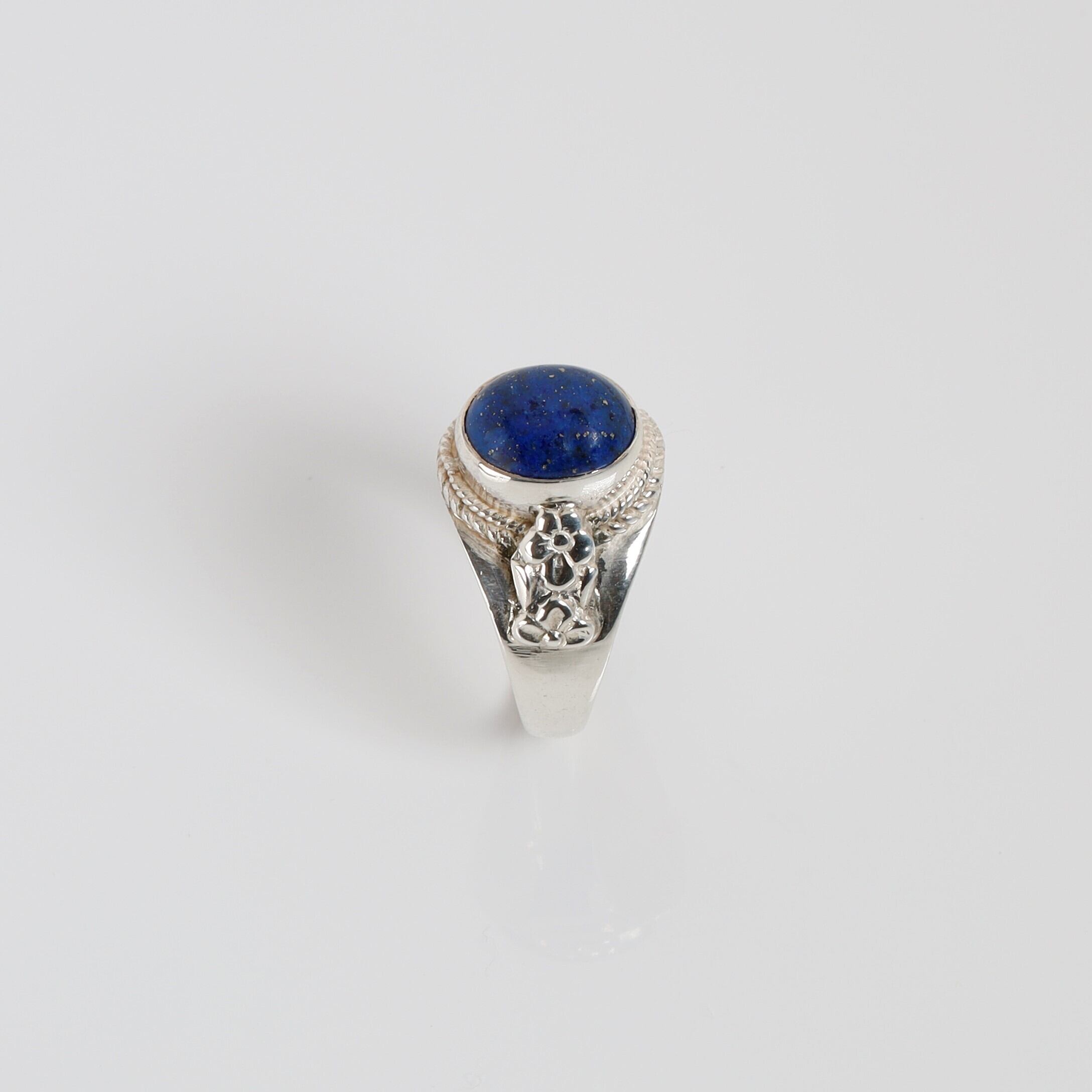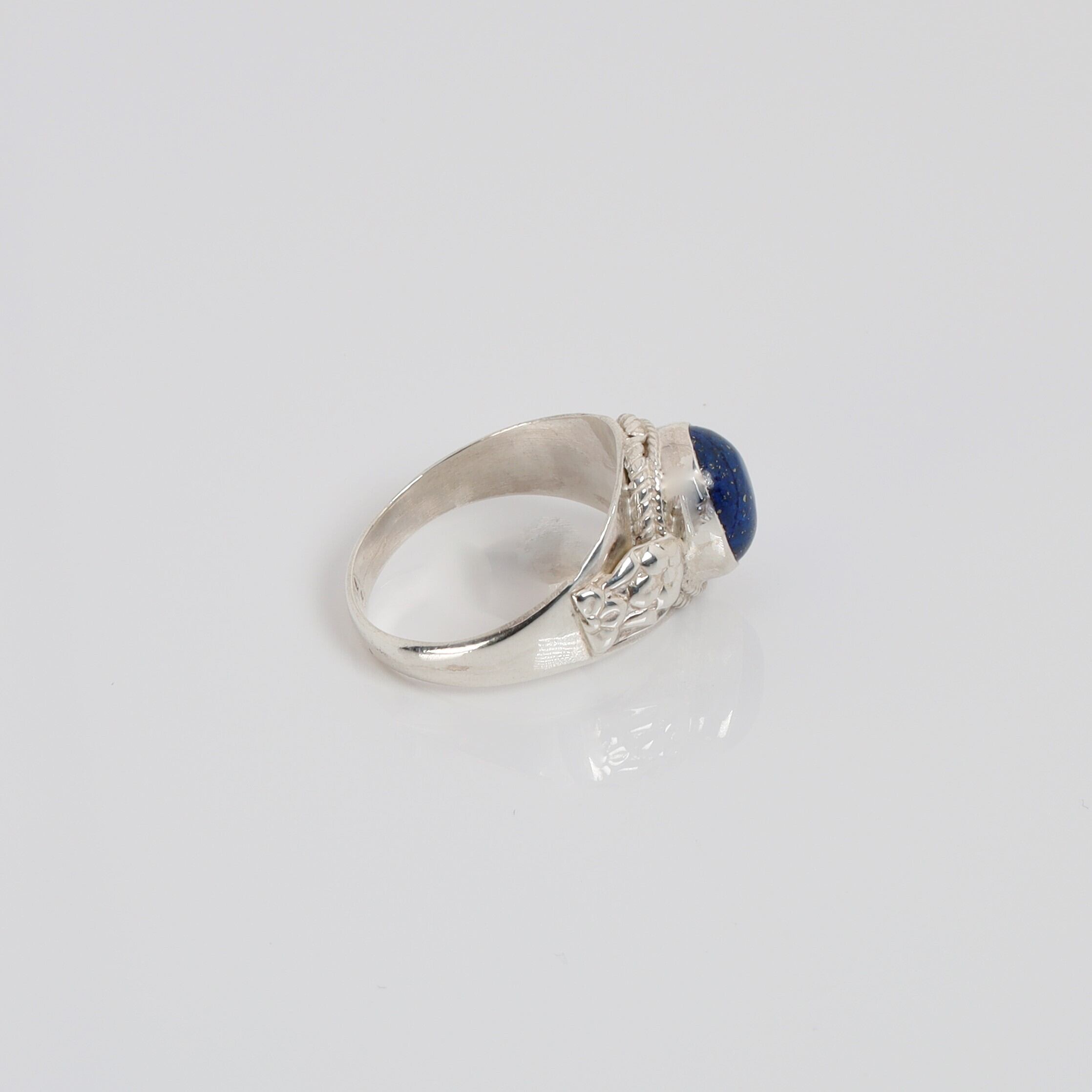 吸い込まれそうな濃紺。そこに浮かぶ白い模様や散りばめられた金色が、まるで夜空の雲や星のようにも見えとても神秘的なラピスラズリをセットしたジェンダーレスなシルバーリングです。