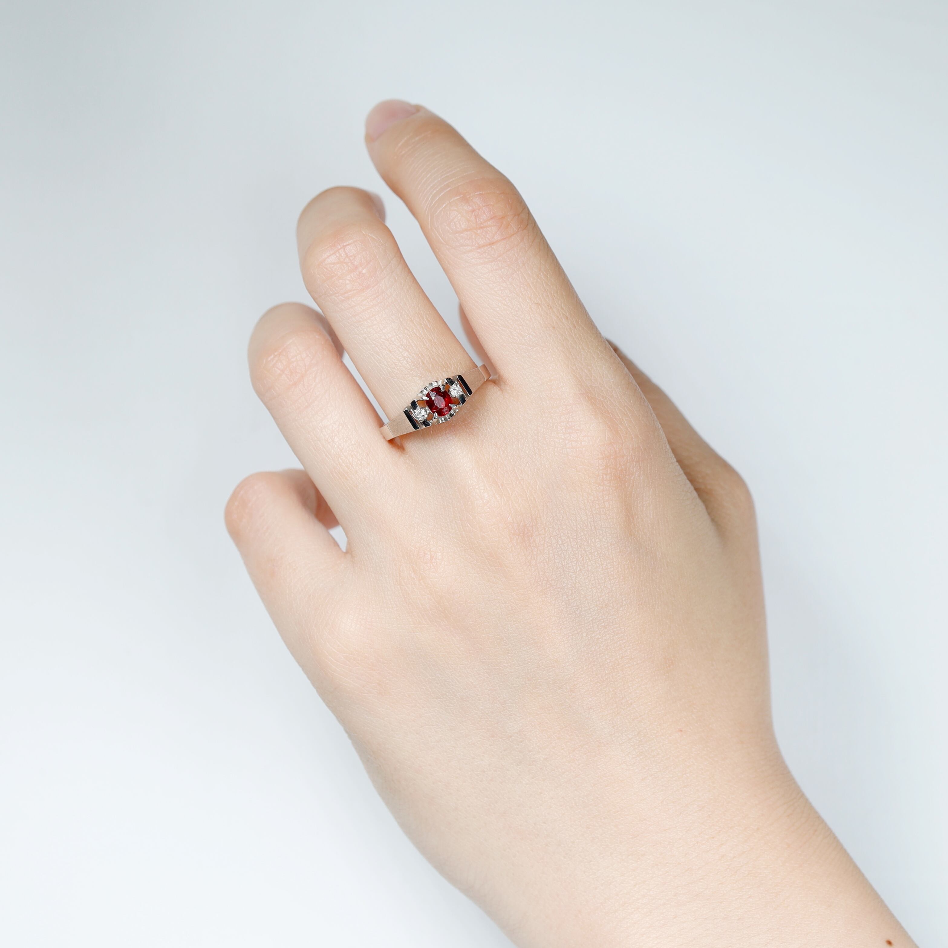 クラシカルなデザインにルビーに、両サイドにダイヤモンドをあしらったヴィンテージリングです。