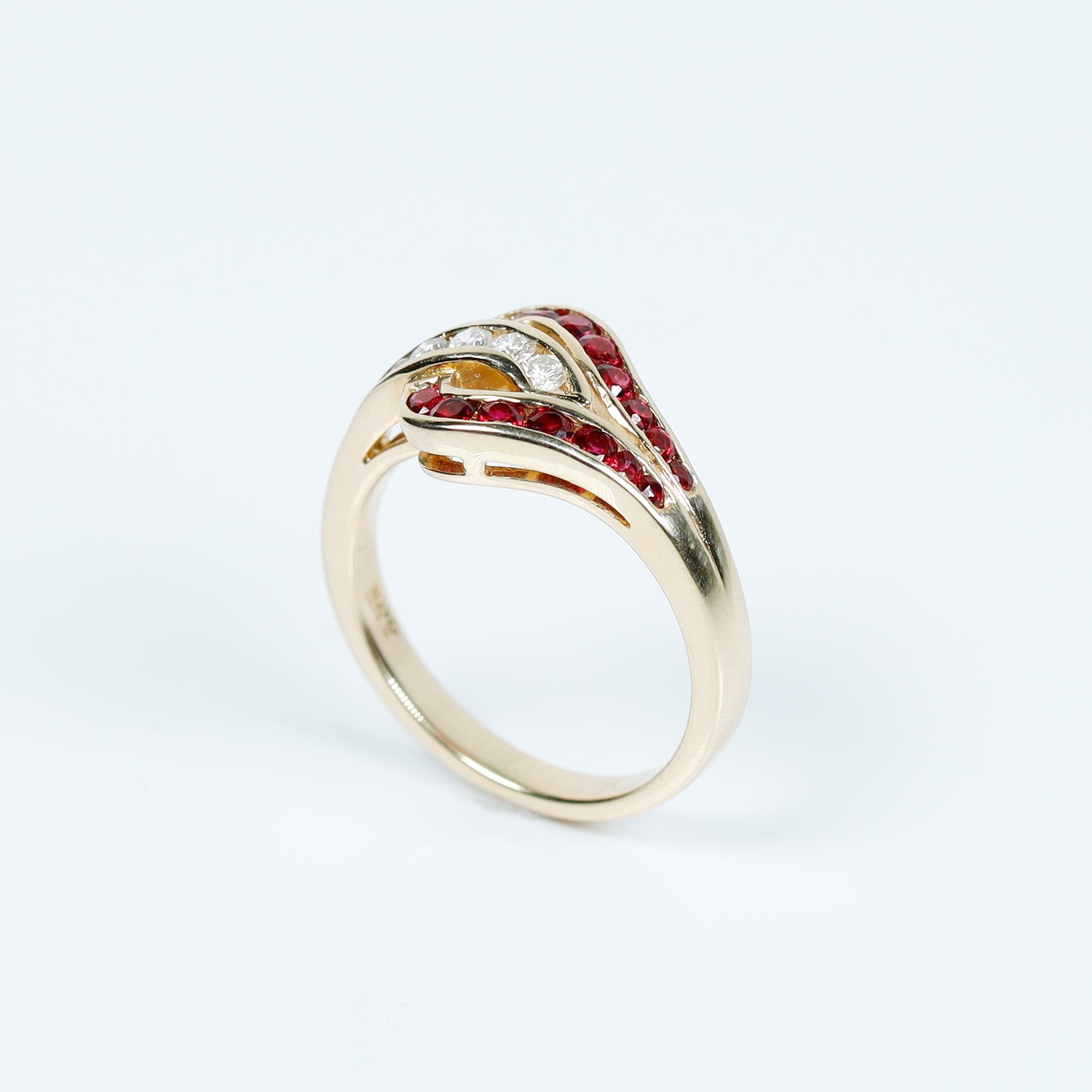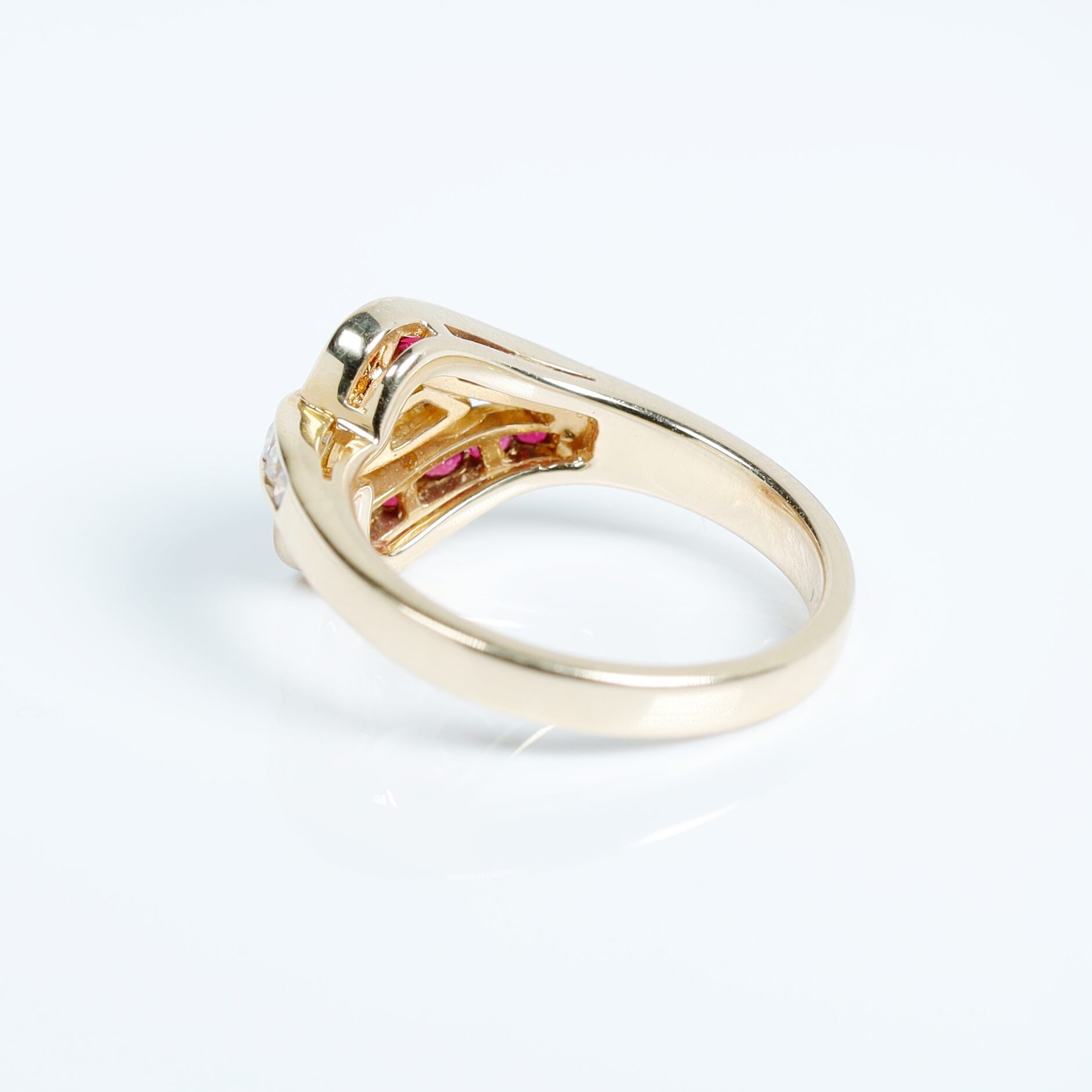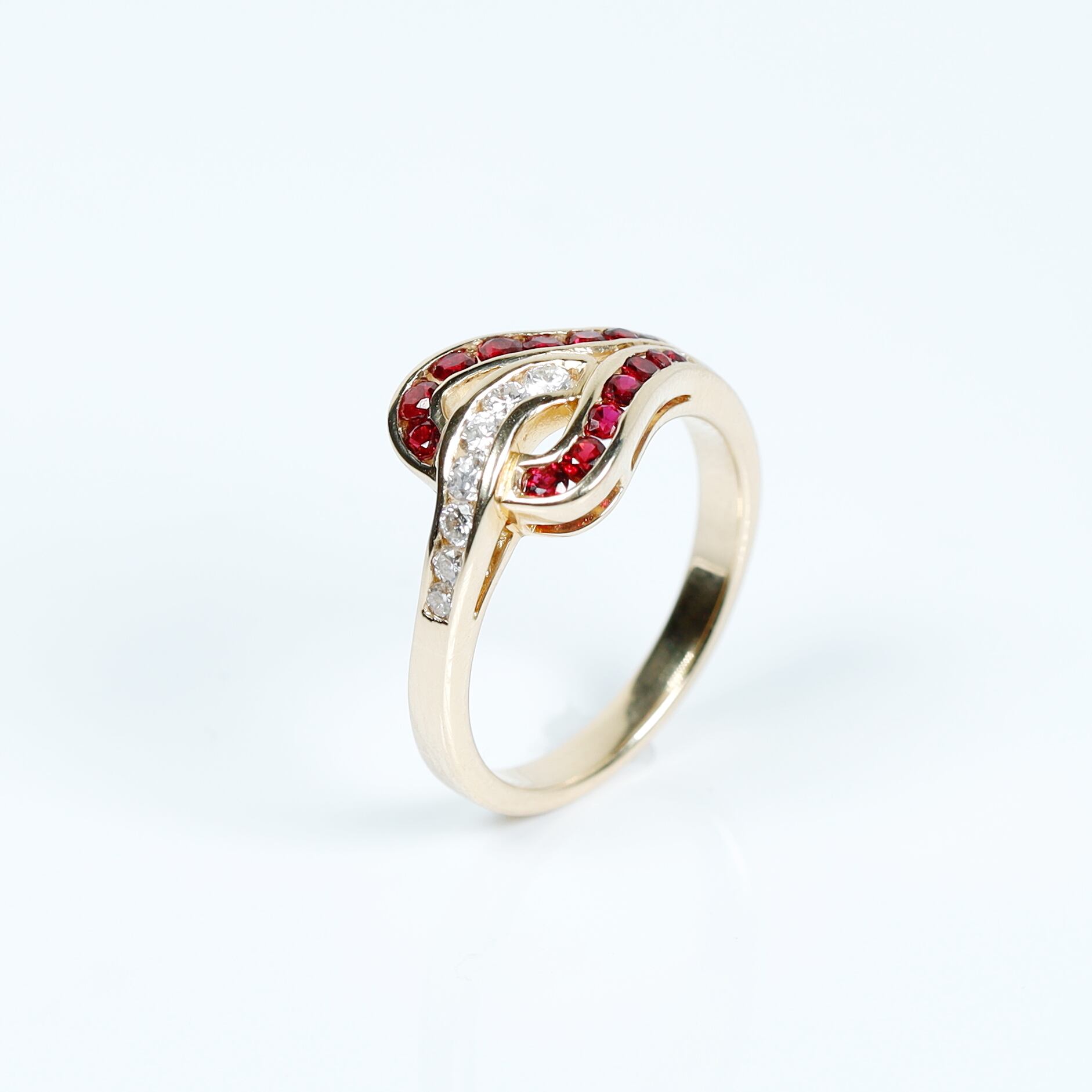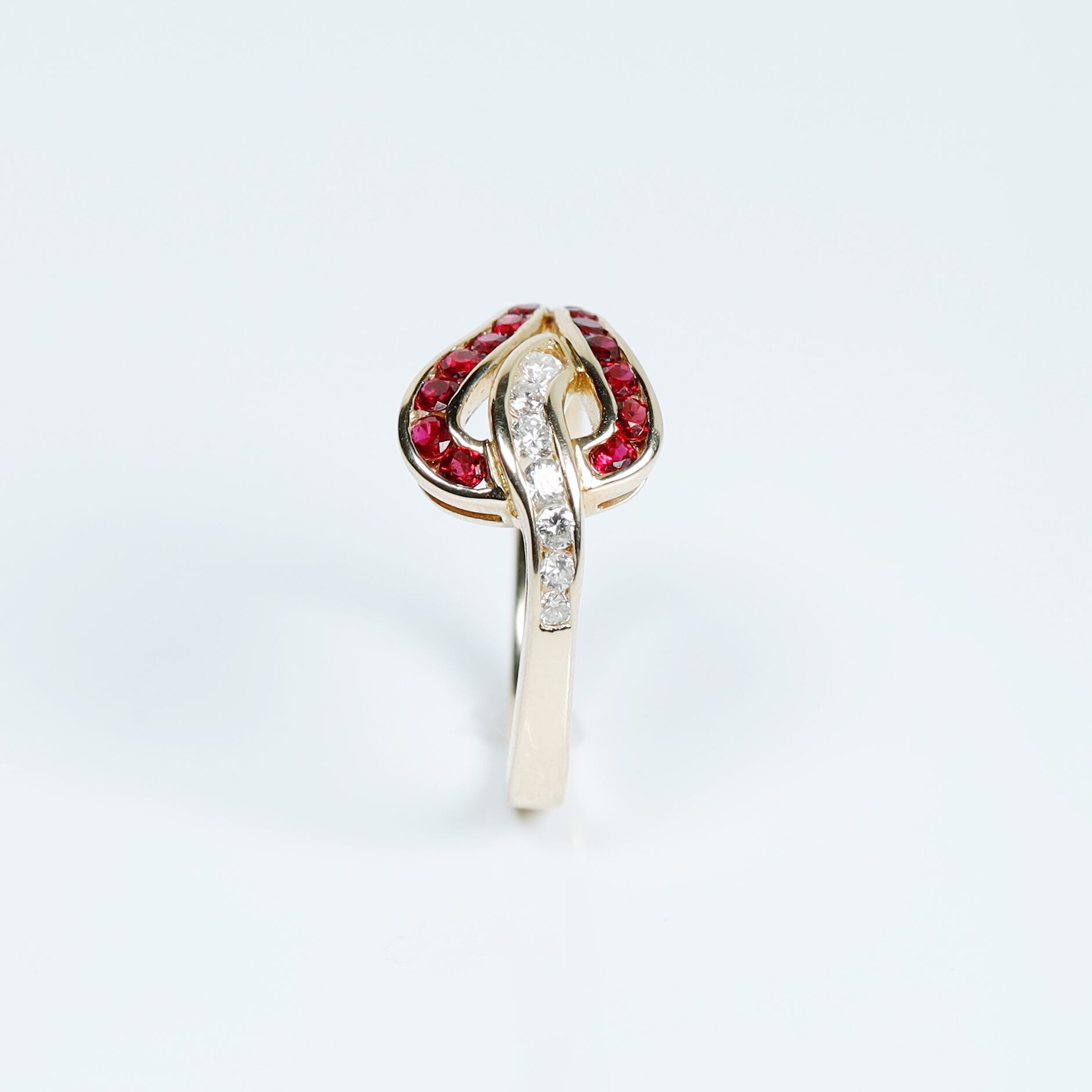 イエローゴールドのリングに華やかなルビーレッドと、きらめくダイヤモンドのコントラストが素敵なヴィンテージリング。