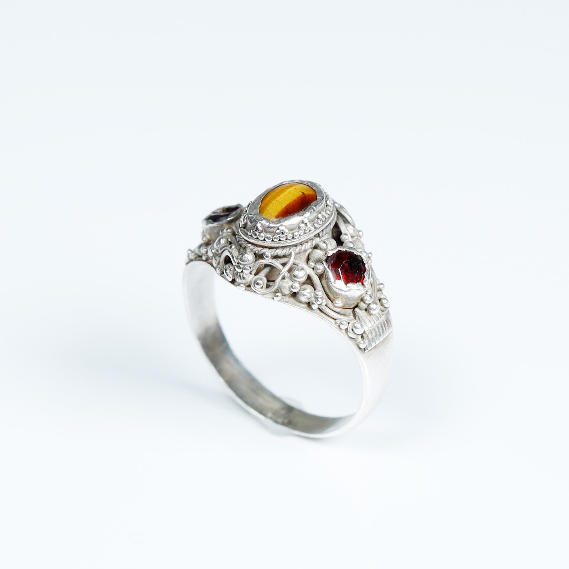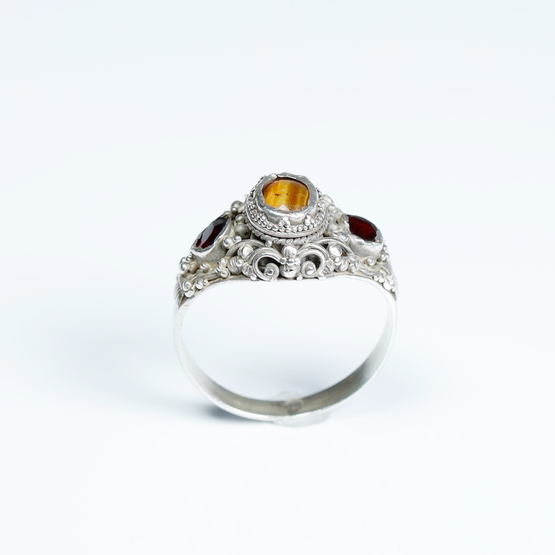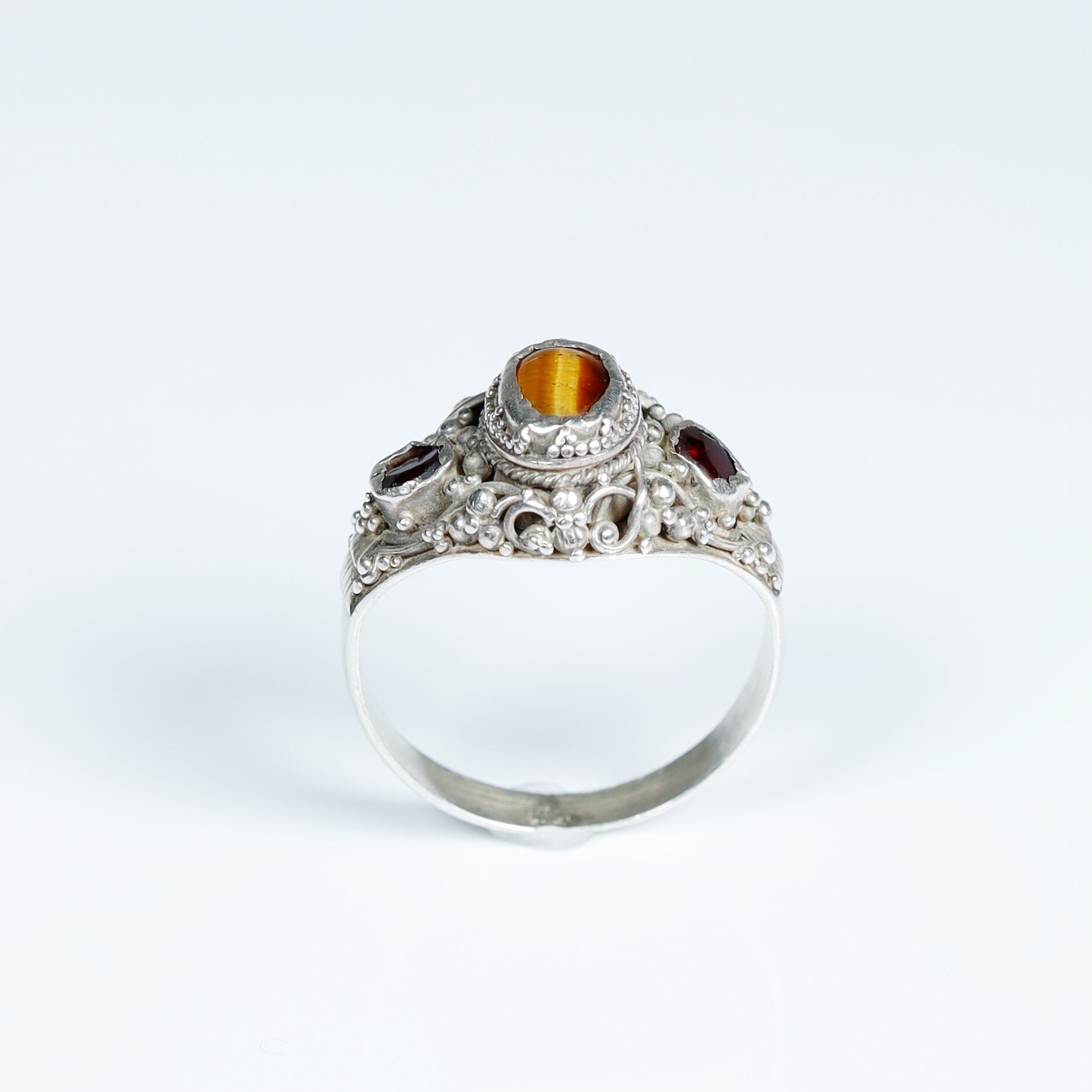 メインにタイガーアイ、両脇にはガーネットをセッティングしたどこかミステリアスでダークな雰囲気漂うビンテージリングです。