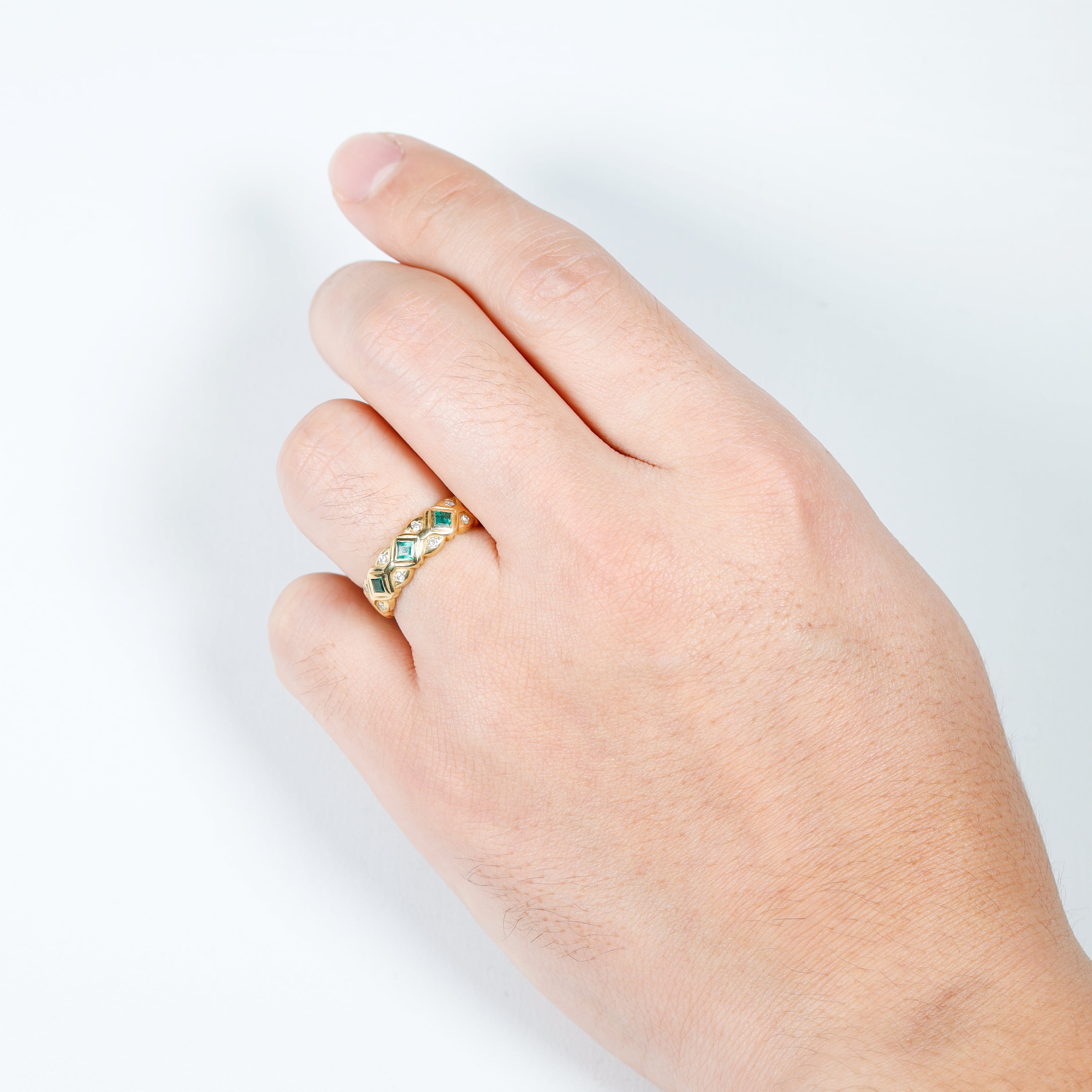 エメラルドグリーンがよく映えるデザインのエキゾチックなヴィンテージリング。
