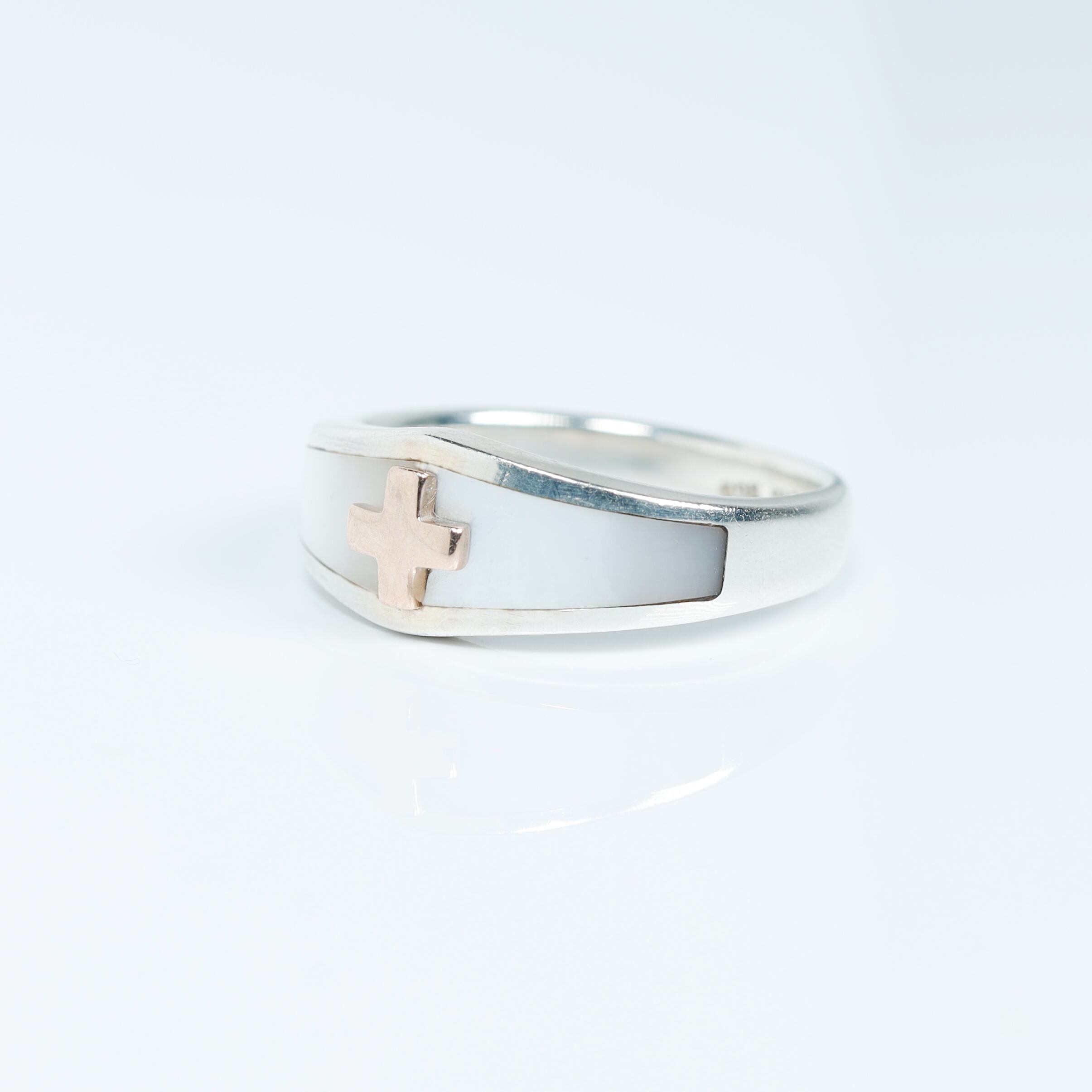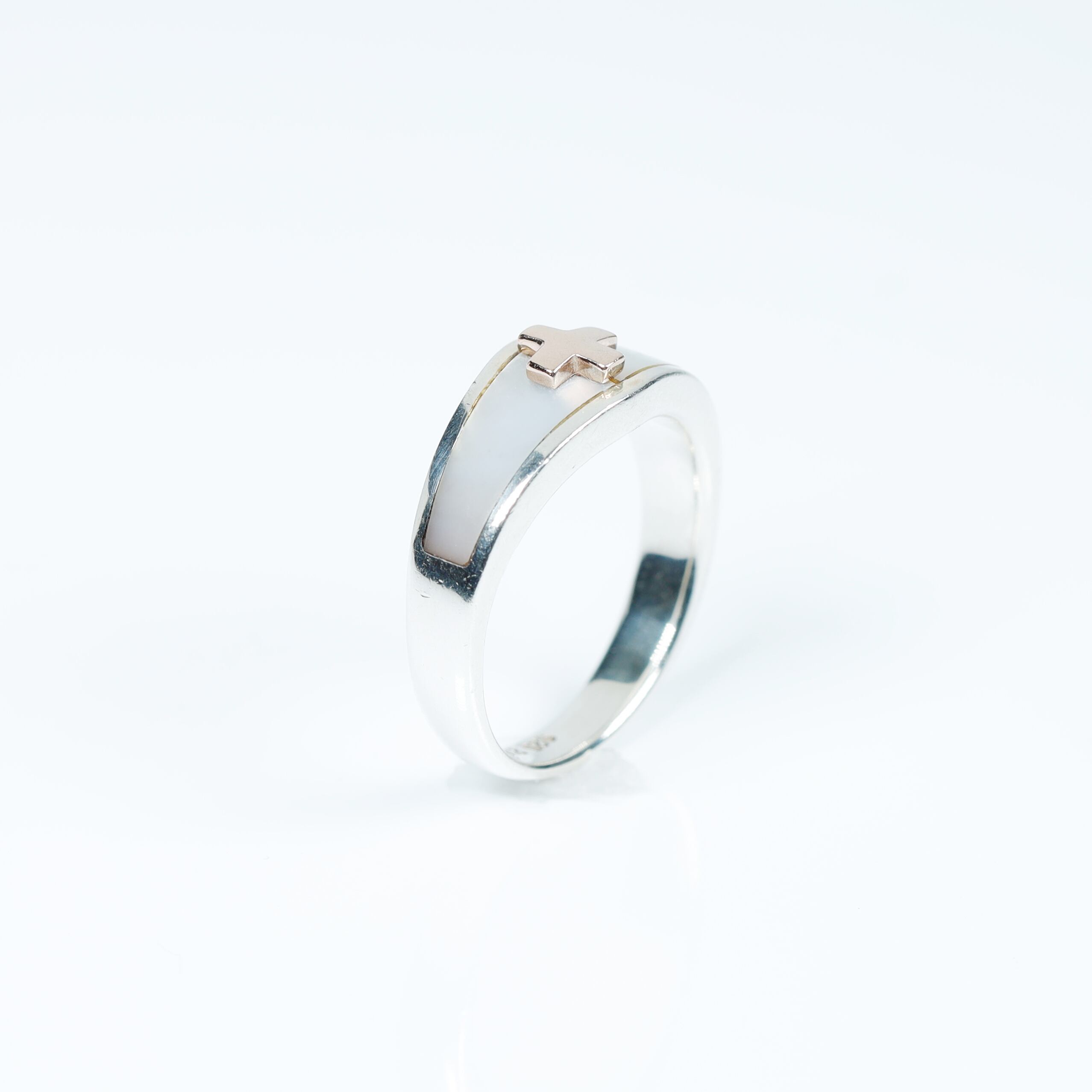 美しいシェルの中に輝く5Kゴールドのクロスが目を惹く上品なシルバーリングです。