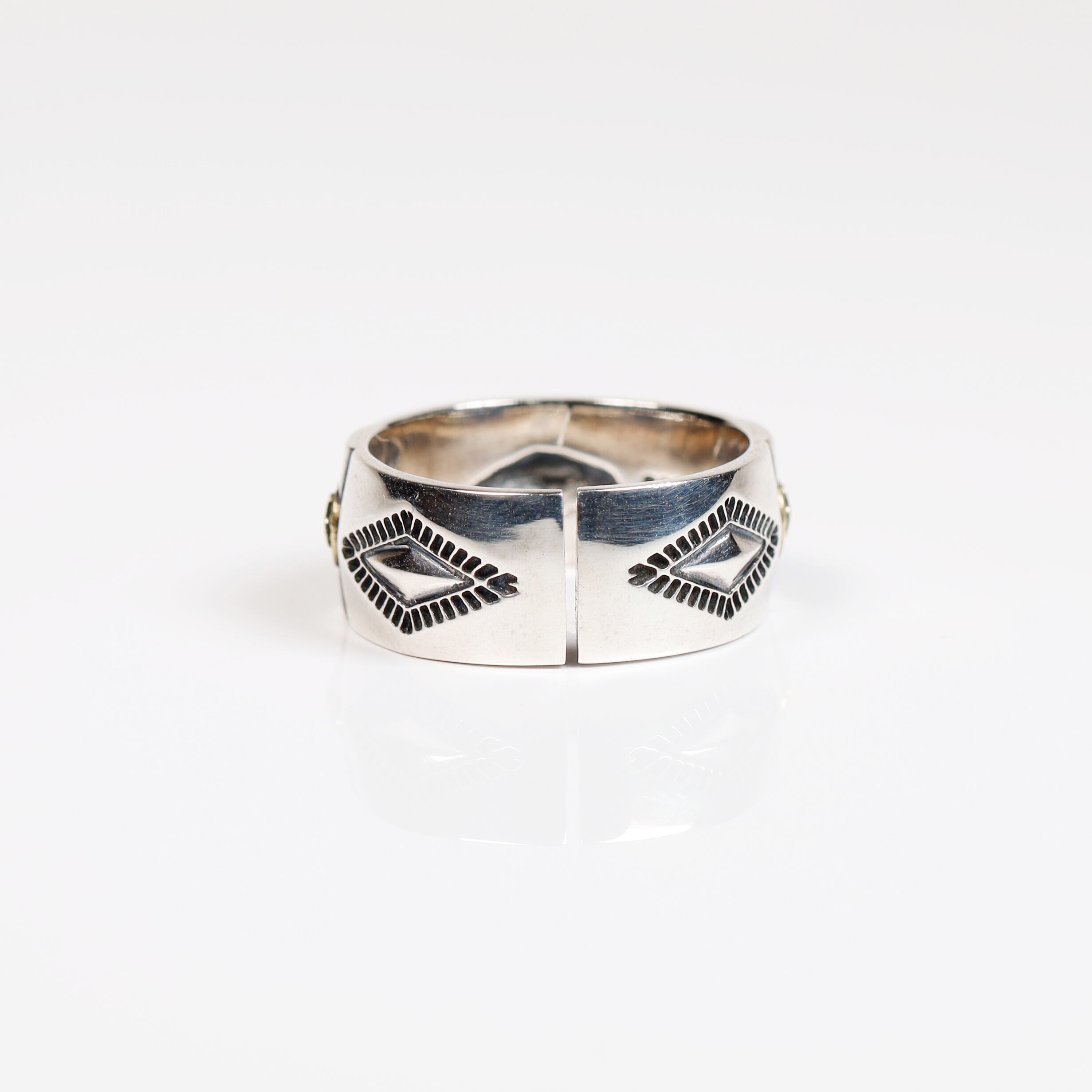 無骨な彫刻をあしらったシルバーリング。