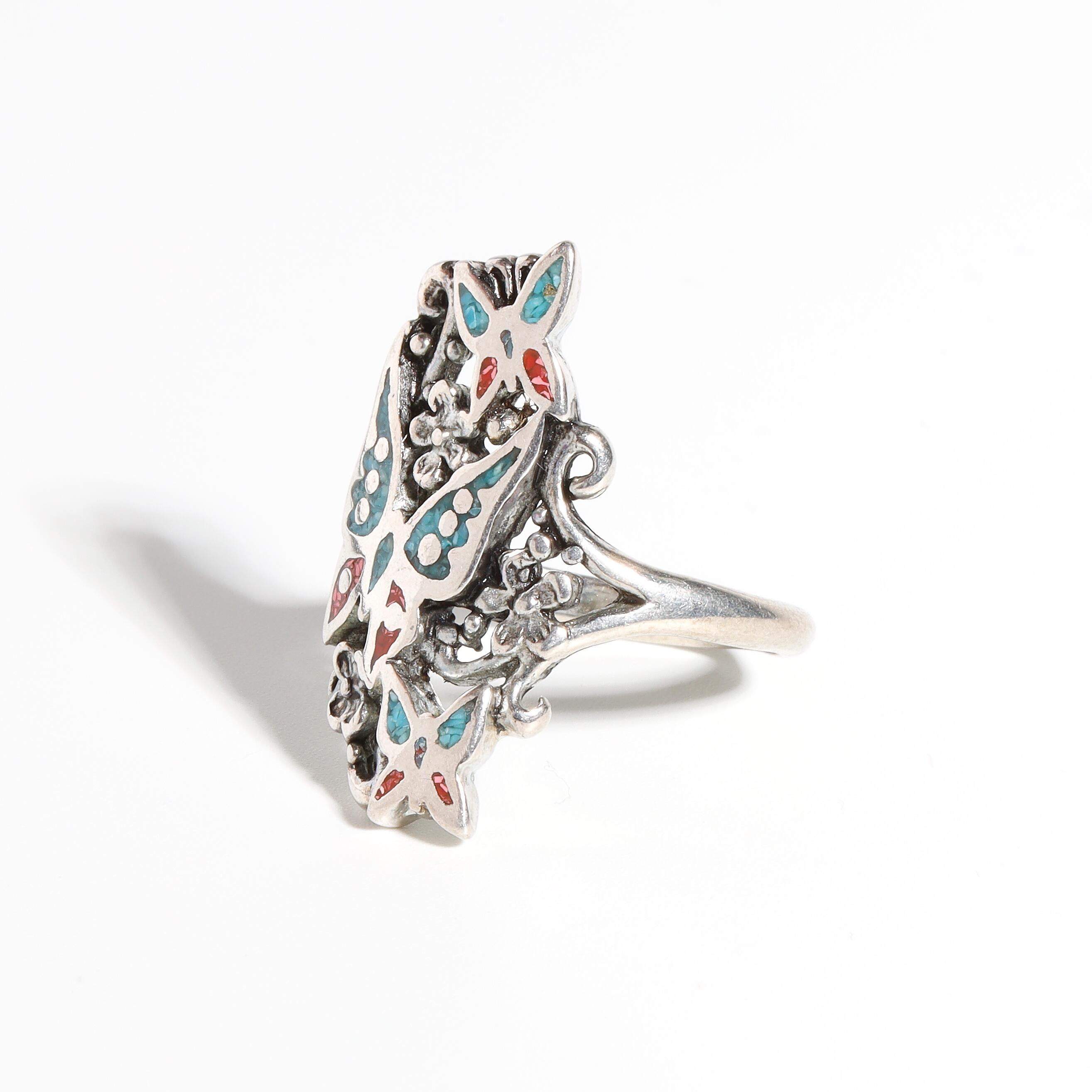 ターコイズとコーラルを細かく砕きセッティングする技法インレイを用いたリングです。